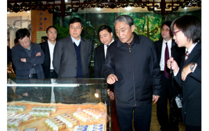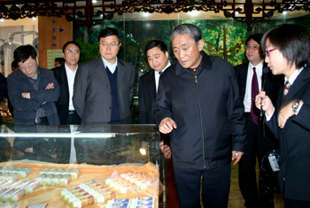2007年11月4日,全國人大常委會副委員長熱地(右三)一行參觀安惠公司的中華靈芝文化館。