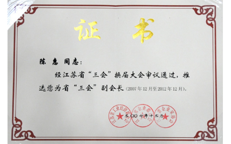 2007年12月,陳惠董事長當選“三會”(江蘇省工業(yè)經濟聯合會、江蘇省企業(yè)聯合會、江蘇省企業(yè)家協會)副會長。