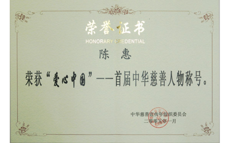 2005年1月31日,中華慈善總會(huì)在北京民族飯店召開新聞發(fā)布會(huì),陳惠董事長當(dāng)選“愛心中國”——首屆中華慈善人物。